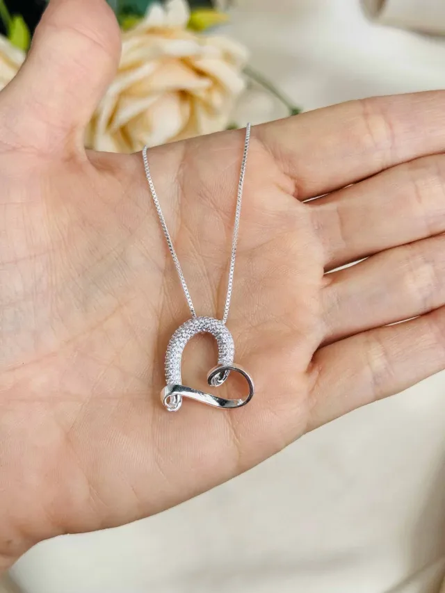 Colar Coração Meio Cravejado Folheado a Prata 925 com 30 Milésimos