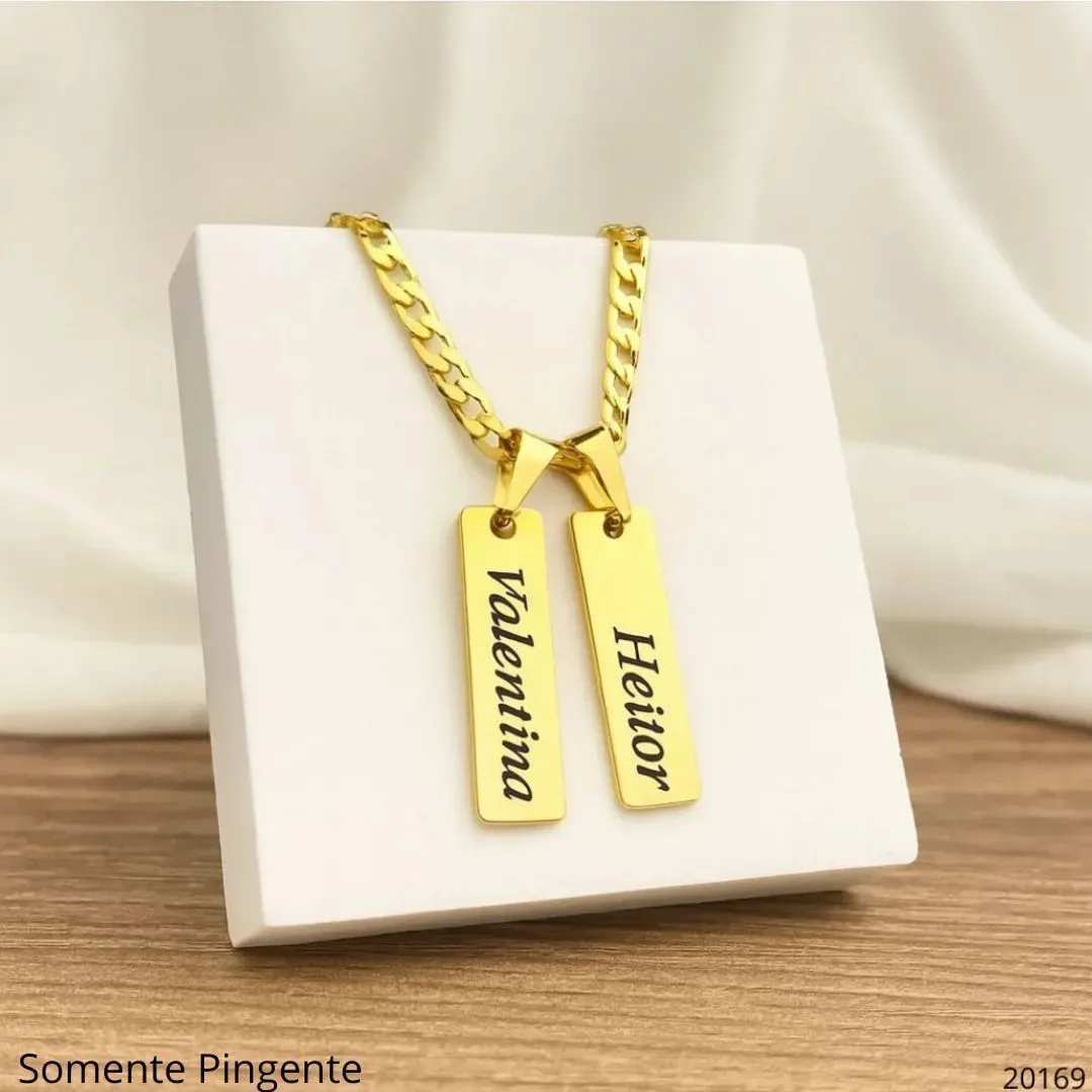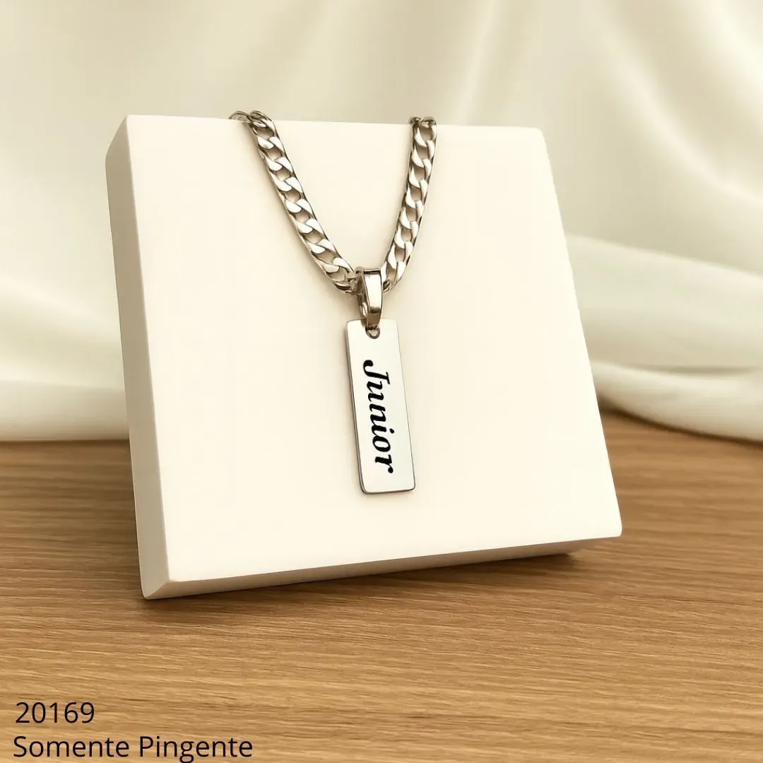 Colar com corrente robusta e pingente retangular gravado com o nome Junior. Metal polido com acabamento elegante, pronto para compor looks modernos e casuais. A corrente de elo grosso oferece durabilidade e um visual marcante, perfeito para uso diário ou como presente especial.