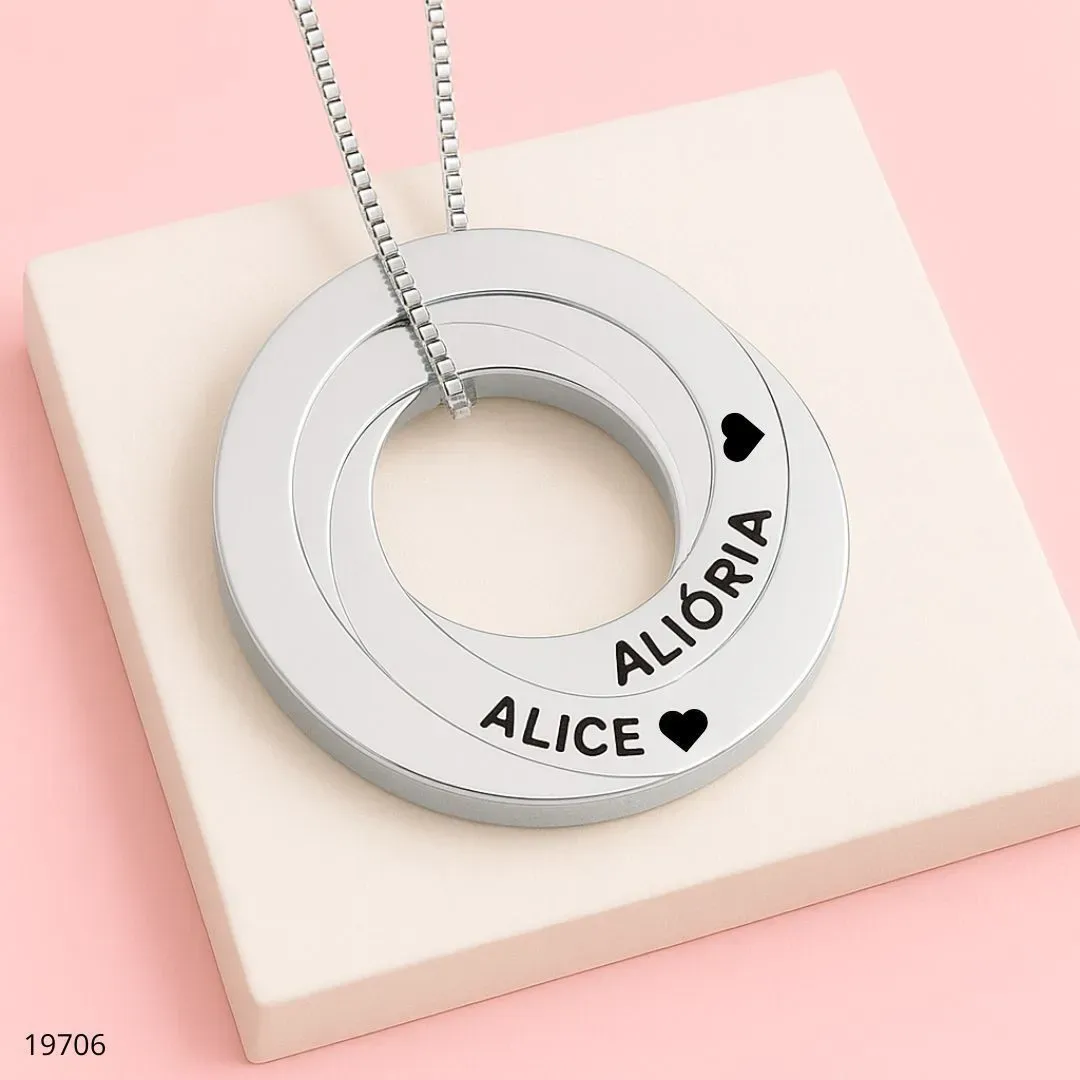 Colar aro dourado com dois aros concêntricos gravados com nomes de sua escolha, formando um design moderno e romântico. Fabricado em metal com acabamento polido e banho dourado durável, acompanha corrente elegante e fechamento seguro. Ideal para presentear alguém especial ou registrar seus nomes em um acessório único que complementa qualquer look.