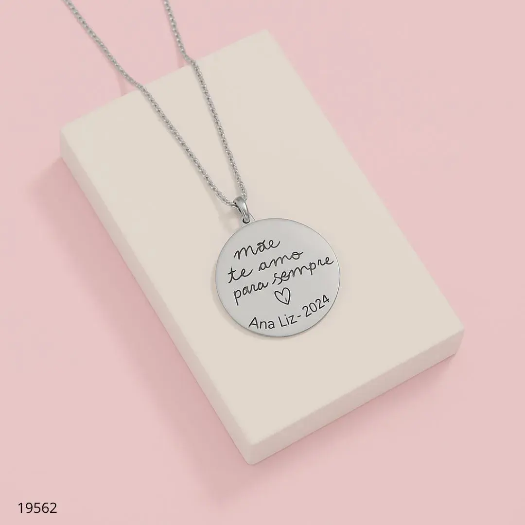 Colar com pingente circular dourado, acabamento polido e corrente elegante. Pingente gravável com a mensagem TE AMO MÃE e espaço para personalização com nome e ano (ex.: Theo • 2024). Peça em metal banhado a ouro, resistente e de alta qualidade. O presente perfeito para Dia das Mães, aniversário ou datas especiais. Combina com qualquer look diurno ou noturno.