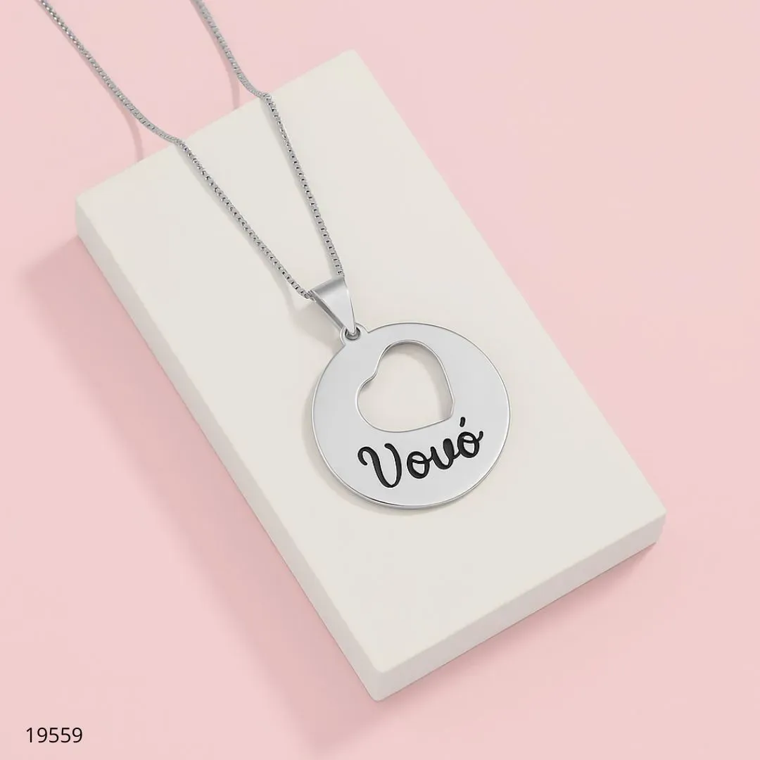 Colar com pingente circular dourado, design com coração recortado e gravação Vovó. Feito em metal banhado a ouro, acabamento polido que brilha em qualquer ocasião. A corrente acompanha o pingente, deixando o visual elegante e delicado. Perfeito como presente para avó, mãe ou quem merece carinho especial. Leve, resistente e ideal para uso diário.