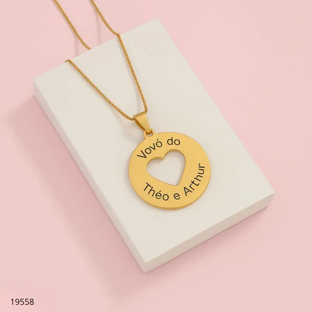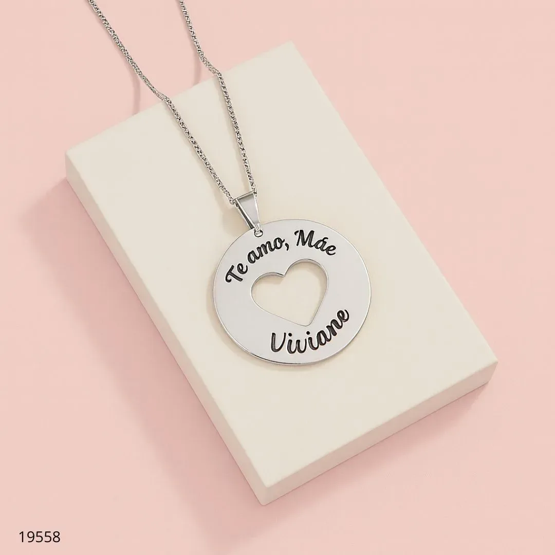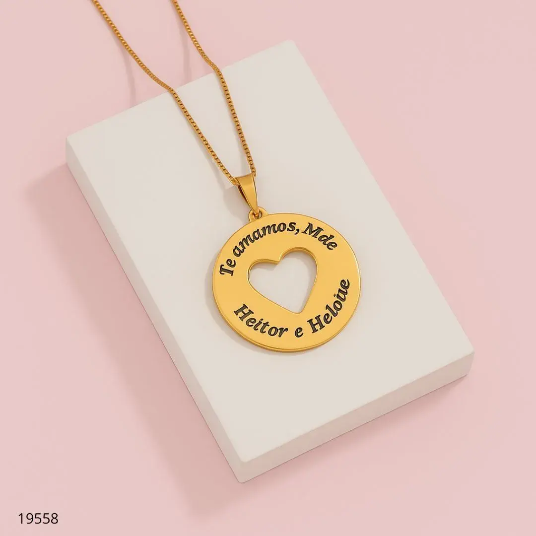 Colar com pingente circular dourado e recorte de coração, feito em metal banhado a ouro. O pingente é gravado com uma mensagem carinhosa e o nome, criando uma joia personalizada que encanta e conecta. A corrente acompanha o conjunto, com acabamento polido que brilha em qualquer ocasião. Perfeito para presentear a mamãe, a pessoa amada ou alguém especial, no dia a dia ou em ocasiões especiais.