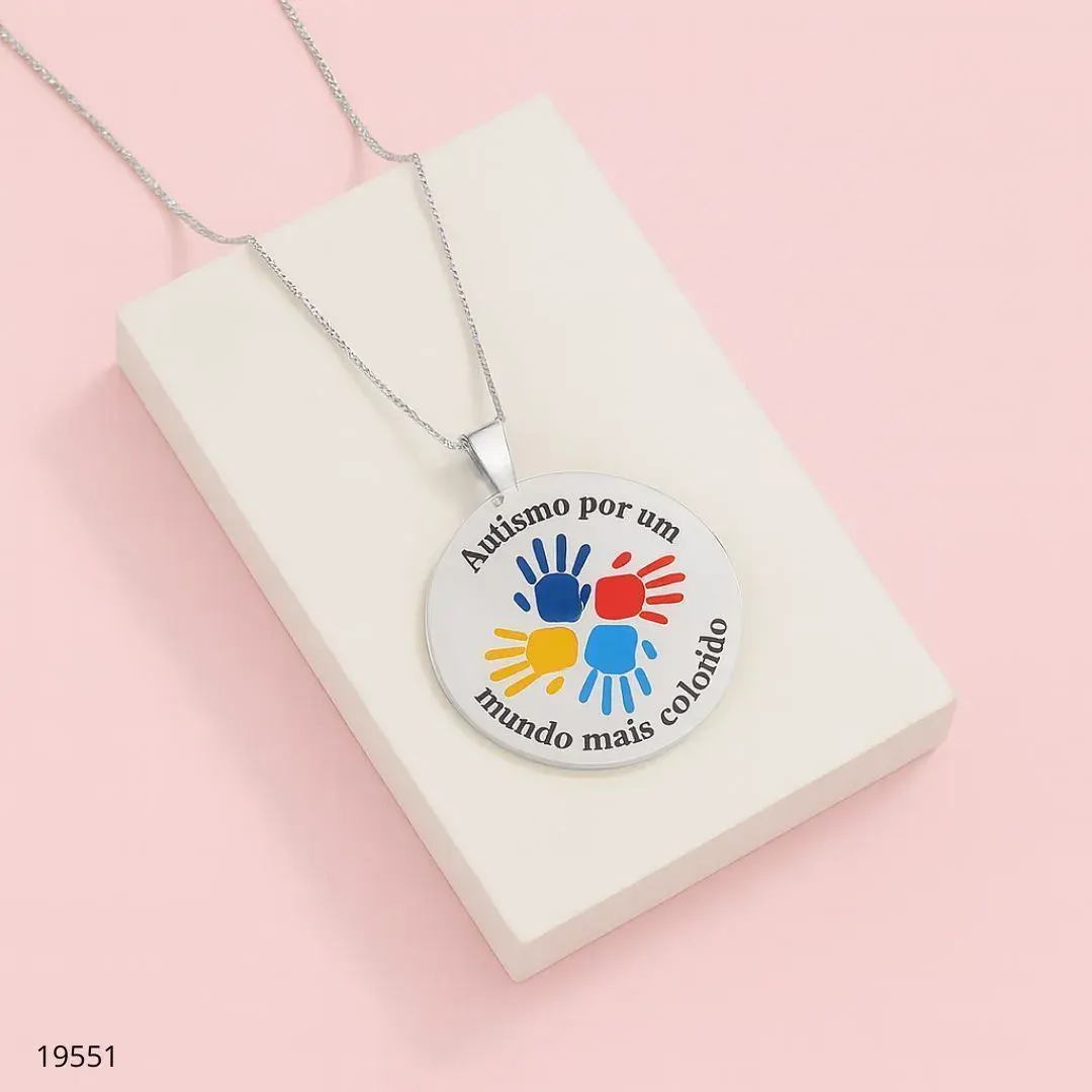 Colar com pingente circular em metal banhado a ouro, ligado a corrente fina. O destaque fica por conta do design com mãos coloridas e a mensagem Autismo por um mundo mais colorido, transmitindo apoio e inclusão. Peça de alta durabilidade, brilho suave e acabamento polido que valoriza qualquer look. Perfeito como presente ou para uso diário e ocasiões especiais.
