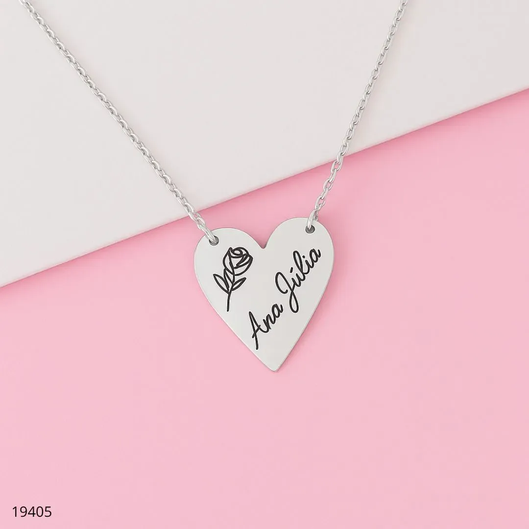 Colar com pingente em formato de coração banhado a ouro, gravado com o seu nome escolhido e um delicado motivo de rosa. Design romântico e moderno que valoriza qualquer look, ideal para presentear ou usar no dia a dia. Corrente robusta, acabamento polido e superfície antialérgica. Personalize já e transforme momentos especiais em lembrança duradoura.