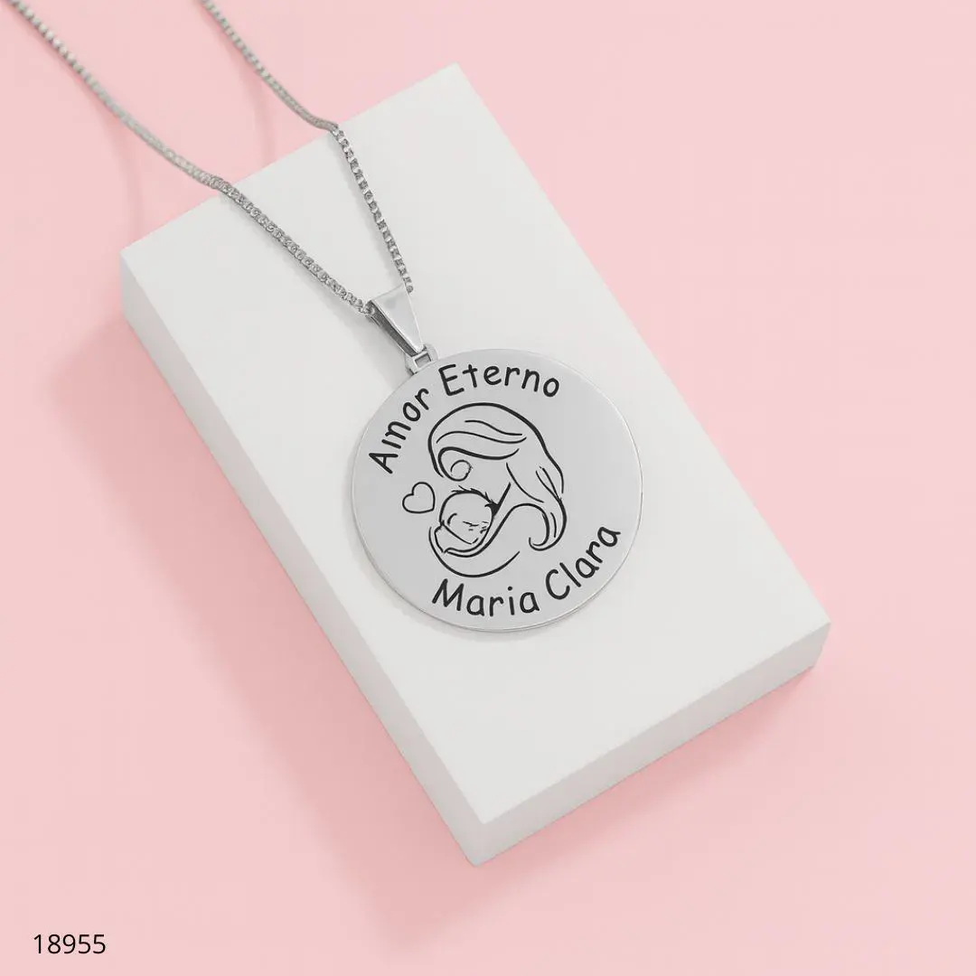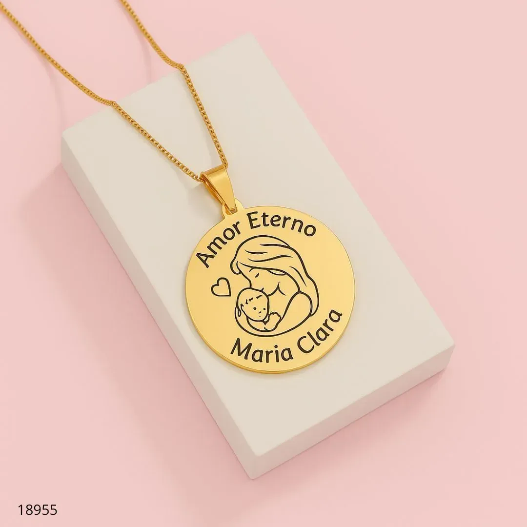 Colar Moedas Nome Personalizado em banho de ouro com pingentes circulares gravados. Cada moeda traz a frase Amor Eterno e os nomes escolhidos, formando uma lembrança única para mães, avós e familiares. Corrente delicada, acabamento polido e fixação segura. Ideal como presente cheio de significado para usar no dia a dia ou em ocasiões especiais. Feito com material de alta qualidade, resistente à oxidação, perfeito para o uso diário e para combinar com outros acessórios.